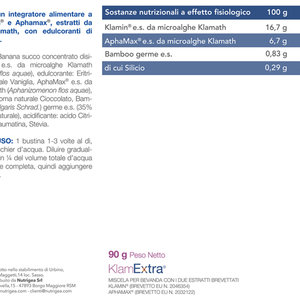 Banana succo concentrato disidratato, Klamin® e.s. da microalghe Klamath (Aphanizomenon flos aquae), edulcorante: Eritritolo; aroma naturale Vaniglia, AphaMax® e.s. da microalghe Klamath (Aphanizomenon flos aquae), amido di Mais, aroma naturale Cioccolato, Bamboo (Bambusa vulgaris Schrad.) germe e.s. (35% Silicio di origine naturale), acidificante: acido Citrico; edulcoranti: Taumatina, Stevia.
